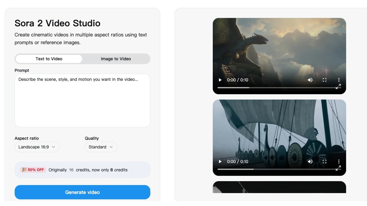 About Sora 2 AI Video GeneratorSora 2 is an AI video generator that turns text prompts into cinematic, lifelike videos. It brings your ideas to life with realistic motion, lighting, and storytelling powered by advanced generative AI.
